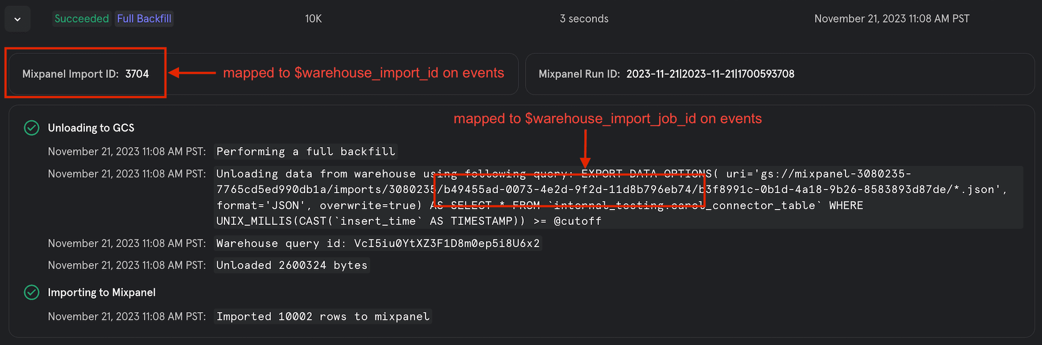 Please filter by tracked name, $warehouse_import_id instead of the display name, “Warehouse Import ID”. You can find the properties values on the Warehouse Connector’ sync logs: